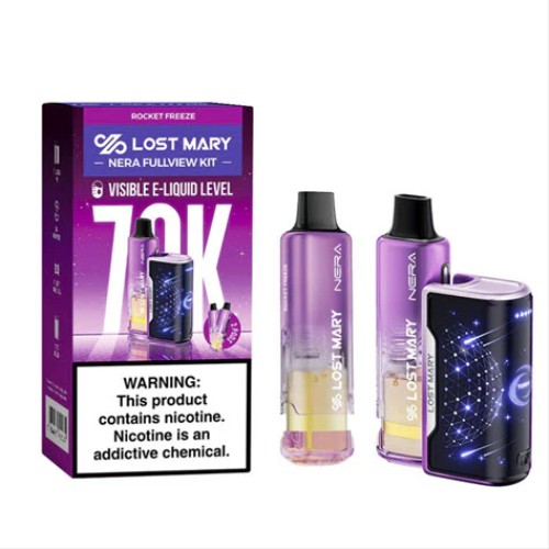 The Lost Mary NERA Fullview 70K Disposable Kit, featuring a 24mL prefilled capacity, two 35,000 puff visible e-liquid pods, and an 800mAh battery.